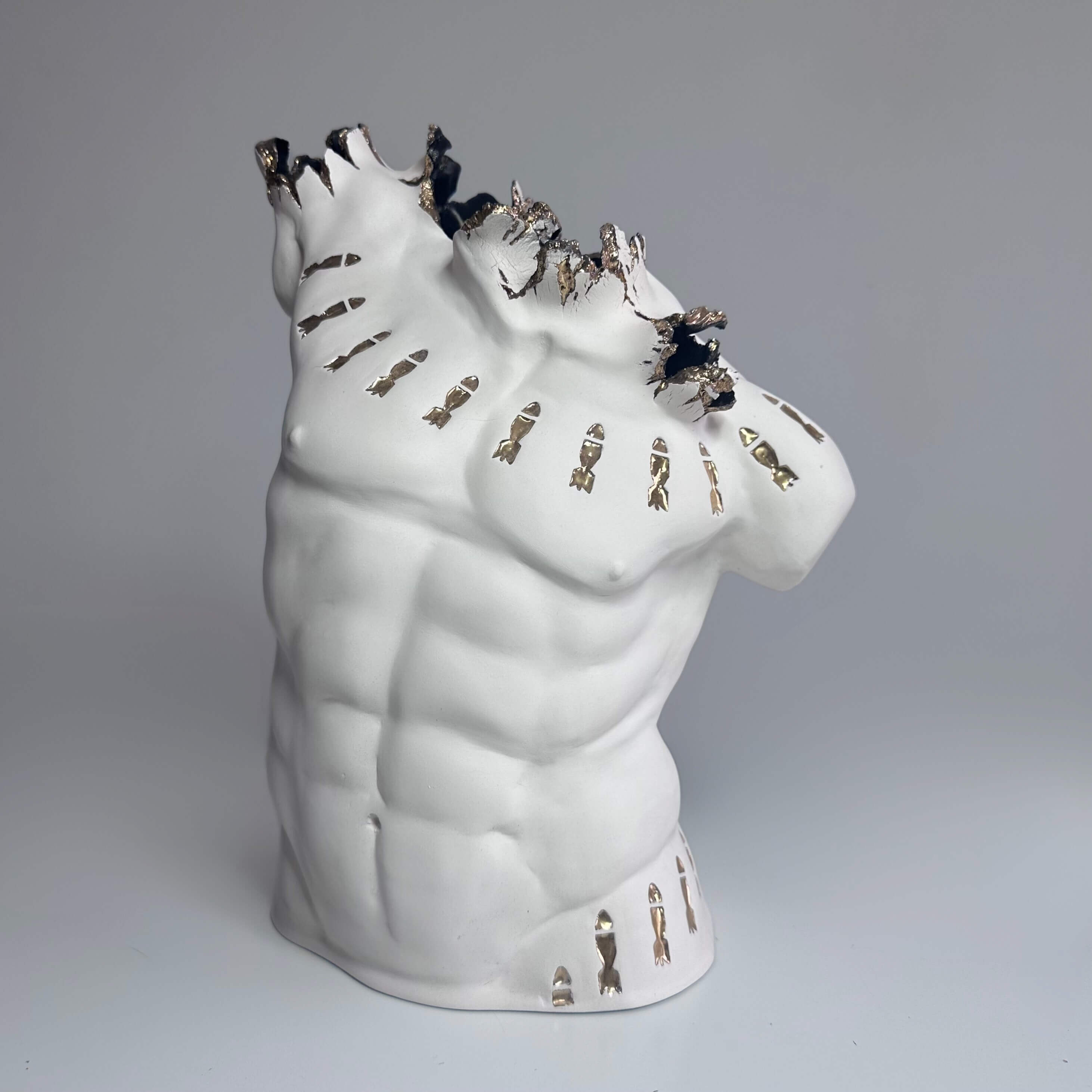 - Ares es una escultura en la que se confronta al espectador con la dualidad entre la belleza dentro del arte y el horror de la guerra. En esta pieza, el uso del oro, en lugar de glorificar, busca denunciar el lucrativo negocio que hay detrás de los conflictos bélicos y cuestiona qué precio se está dispuesto a pagar por los intereses que subyacen detrás de cada conflicto.