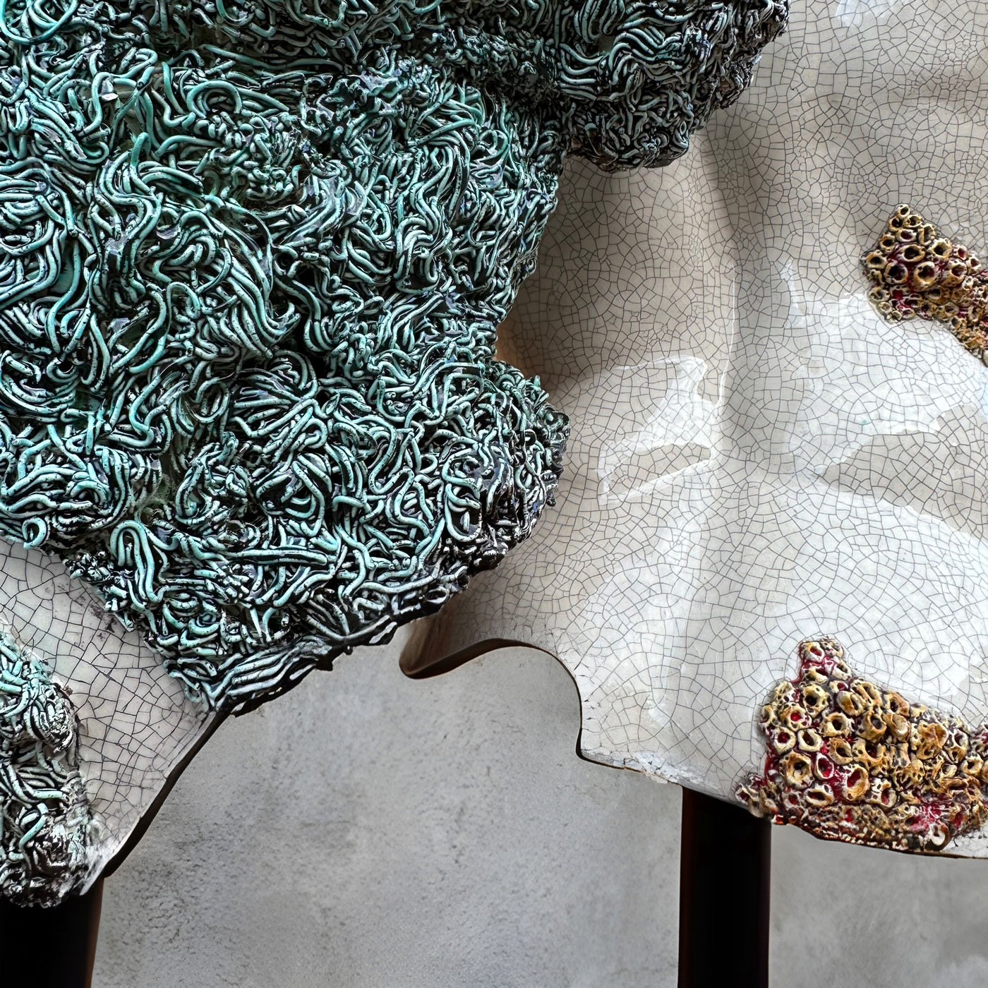 En este sentido, interregno es, ese espacio liminal en el que ambas partes intentan coexistir. Es una lucha donde lo humano ha entrado en crisis y lo natural está aún en proceso de reclamar su lugar. Las piezas se inspiran en elementos marinos tales como las algas y los corales.