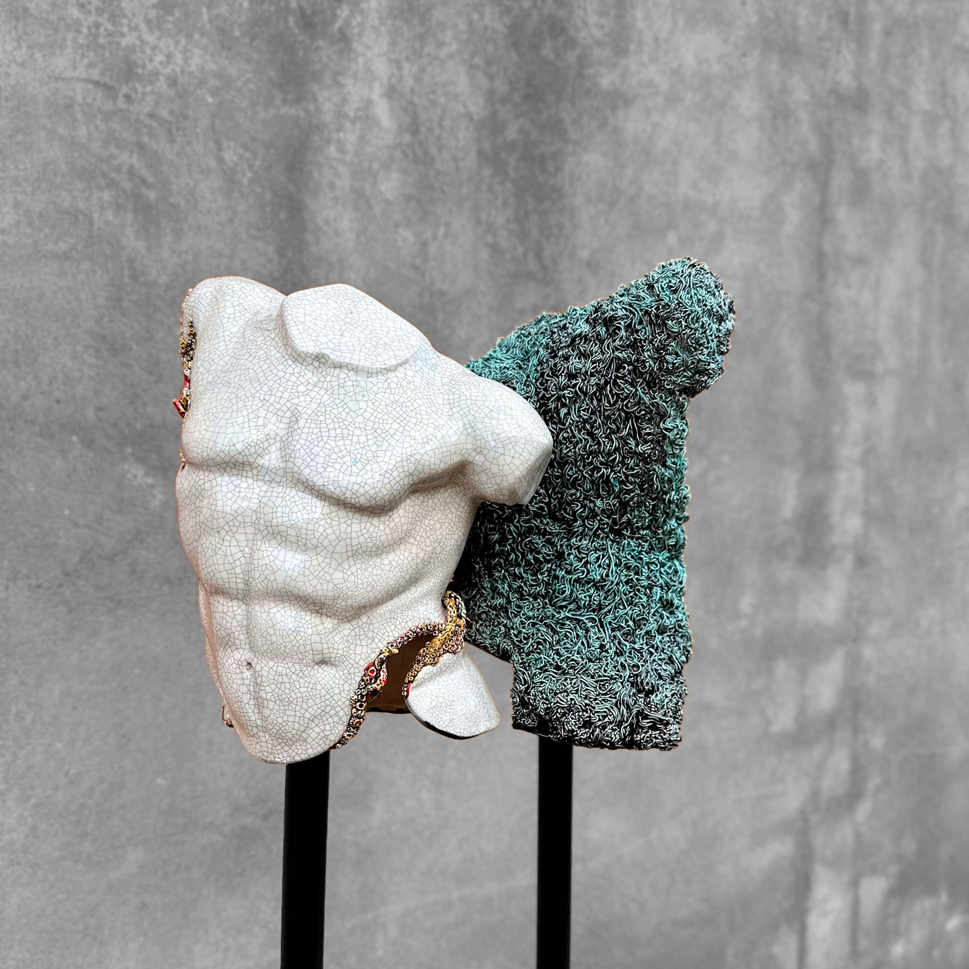 En esta serie de bustos cerámicos se aborda la relación entre el ser humano y la naturaleza, tratando de reflejar un estado de transición y conflicto, en busca de un equilibrio tan necesario como utópico.